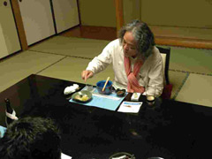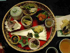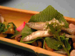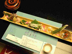 対談は、永芳閣自慢の富樫料理長の腕をふんだんに振るった懐石を食しながら始まった。前日に裏山で採取してきた、青竹の春が瑞々しく先付けを彩っていた。
