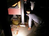 先ほどの「翔鶴」の床下です。上から確認したところ、水道、排水溝がありました!下に潜って更に確認中の中村。「うん、これなら何とかなりそうだ。」どこにでも入り込んで、自分の目で確かめます。